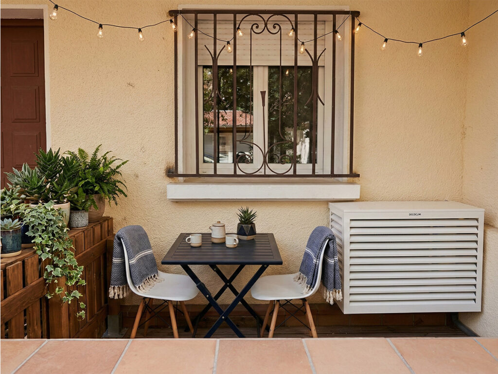 Esthétique Extérieure : Le cache DECOCLIM transforme un bloc technique en un élément de mobilier de terrasse élégant.