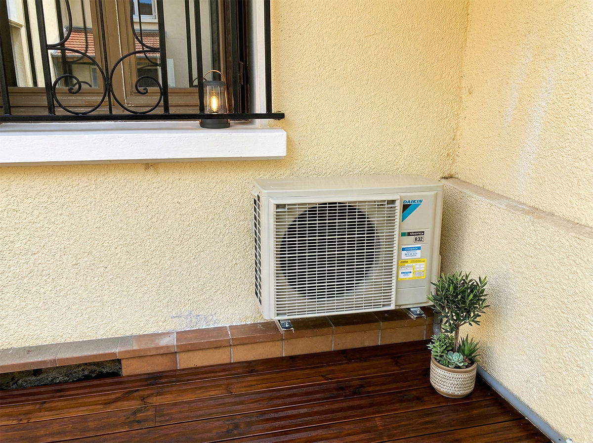 - À l’extérieur : Pour respecter l’esthétique de la copropriété et protéger l’équipement, nous avons installé un cache-groupe DECOCLIM. Ce coffrage design en bois (ou métal selon le modèle) permet de camoufler l’unité extérieure tout en garantissant une circulation d’air optimale pour le rendement de la machine.